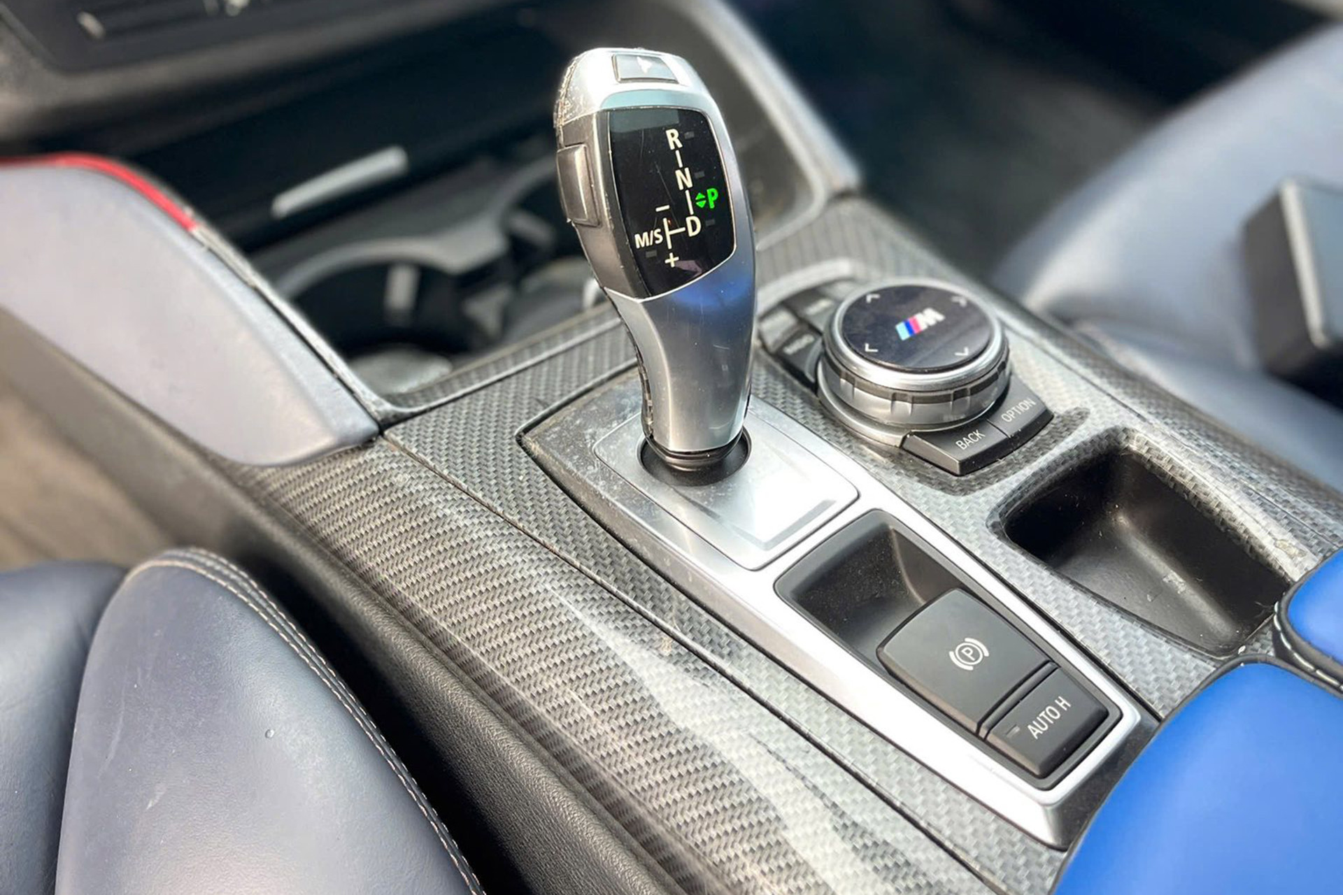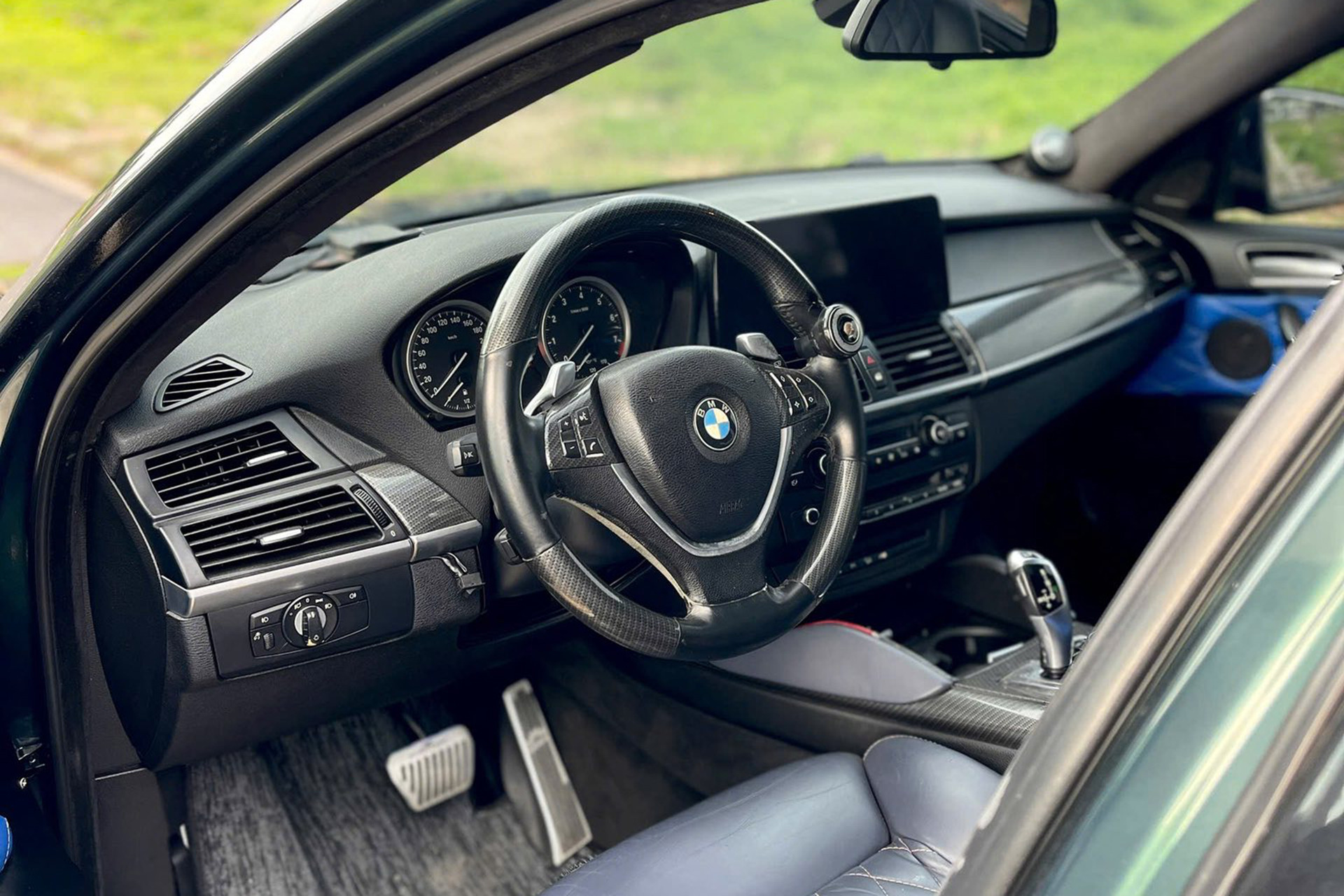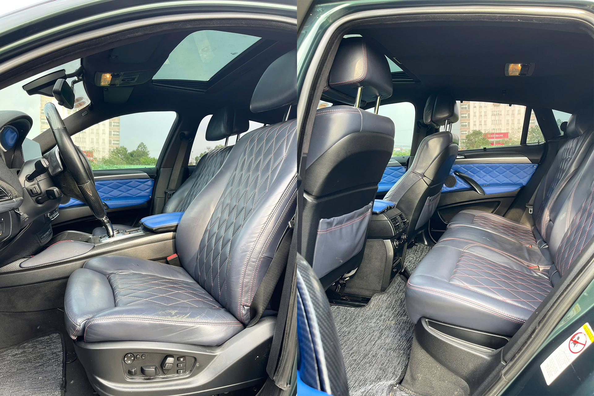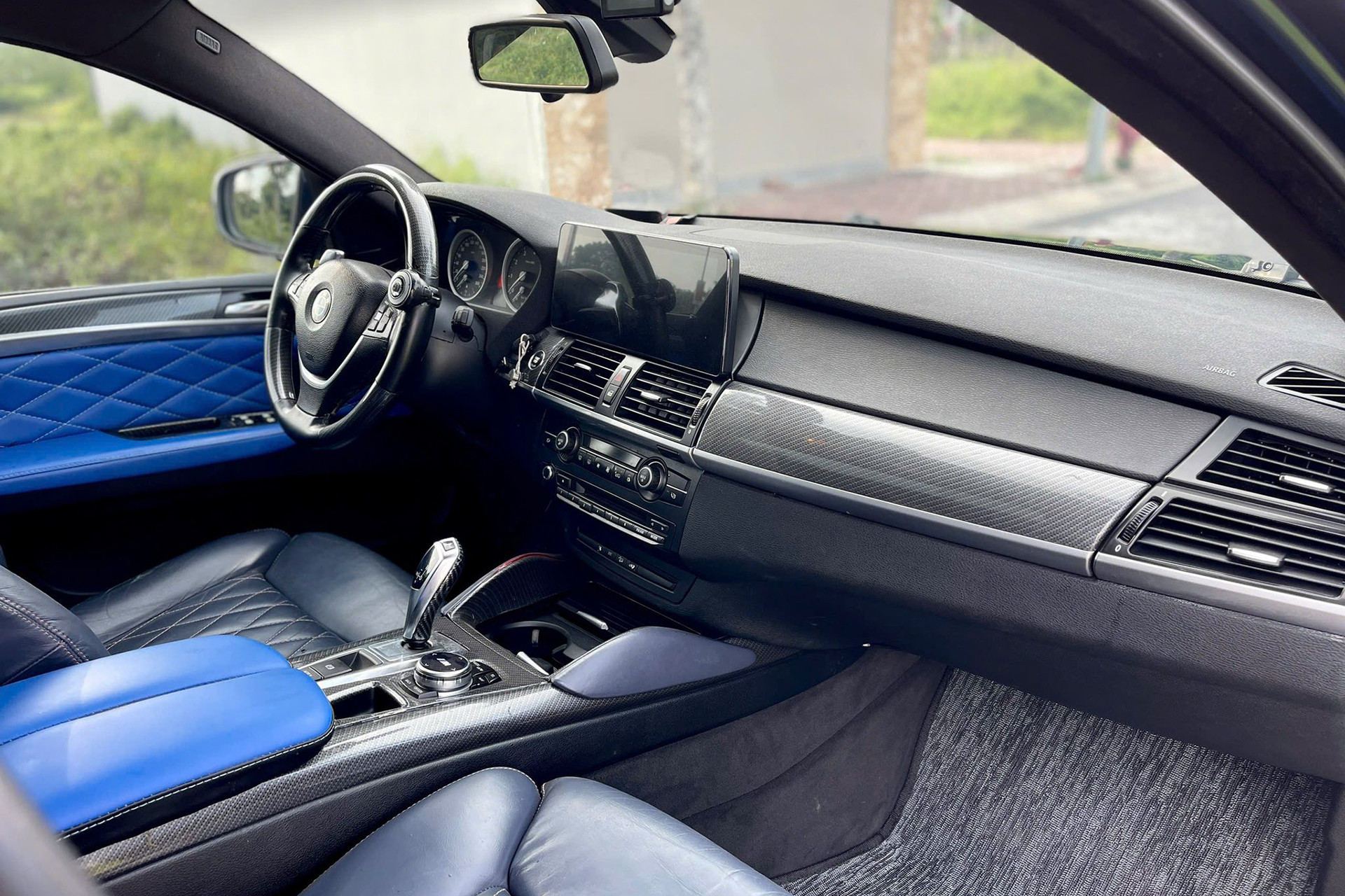 Nội thất xe bọc da màu đen kết hợp cùng màu xanh dương, tạo sự mới mẻ cho khoang cabin xe sau nhiều năm sử dụng. Ghế ngồi bọc da tuy đã nhiều vết nhăn nhưng vẫn có chức năng chỉnh điện, nhớ vị trí. Do thuộc bản cao cấp, chiếc X6 này có thêm hệ thống điều hòa tự động 2 vùng, cửa sổ trời. Một số chi tiết được ốp sợi carbon trang trí, giúp tăng vẻ thể thao.