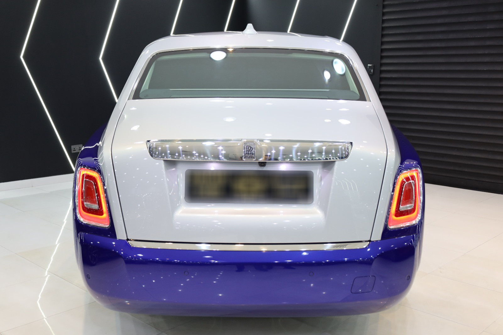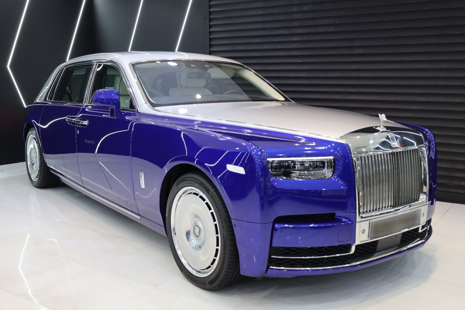So với nhiều chiếc Phantom VIII khác tại Việt Nam, chiếc xe này đặc biệt hơn nhờ ngoại thất kết hợp hai màu xanh dương và trắng ngọc trai. Với kiểu phối màu sơn 2 tông màu, chủ xe phải tốn ít nhất 15.000 USD (khoảng 392 triệu VNĐ).