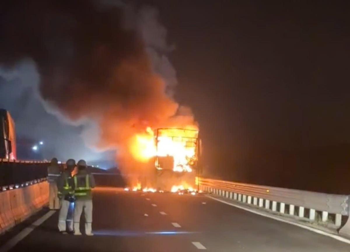 Sau đó, ngọn lửa bùng lên dữ dội và bao trùm toàn bộ xe. Nhiều phương tiện đang lưu thông trên tuyến buộc phải dừng lại do ngọn lửa bùng phát mạnh.