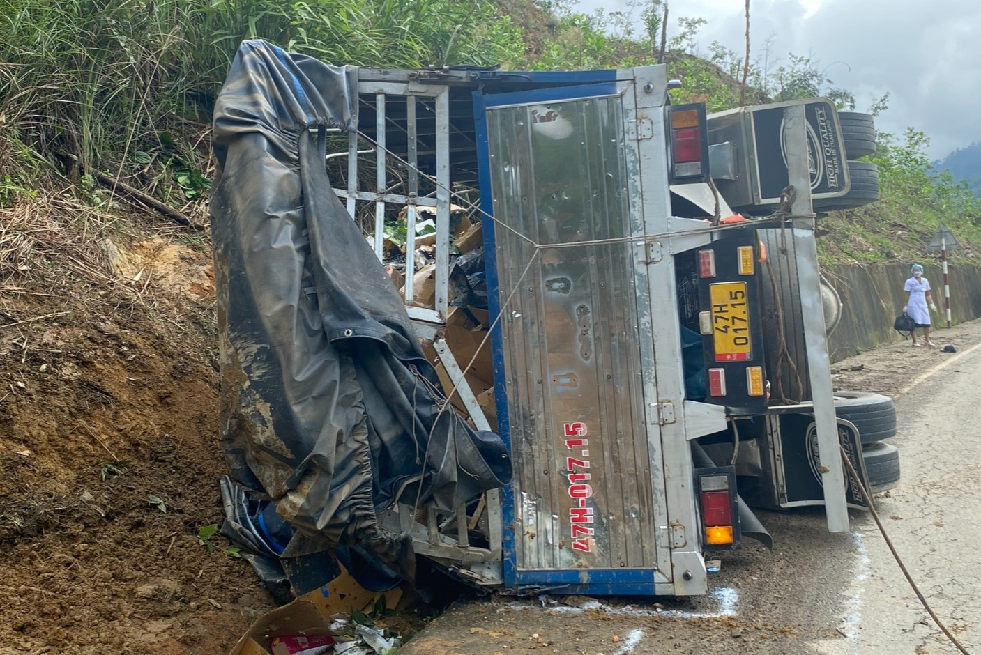 Theo đó, khoảng 7h15 cùng ngày, xe tải 47H-017.15 chạy hướng từ Kon Tum - Đà Nẵng, đến Km 1370+900 đường Hồ Chí Minh (đoạn qua xã Phước Xuân, huyện Phước Sơn) thì mất lái, lao vào taluy bên đường.