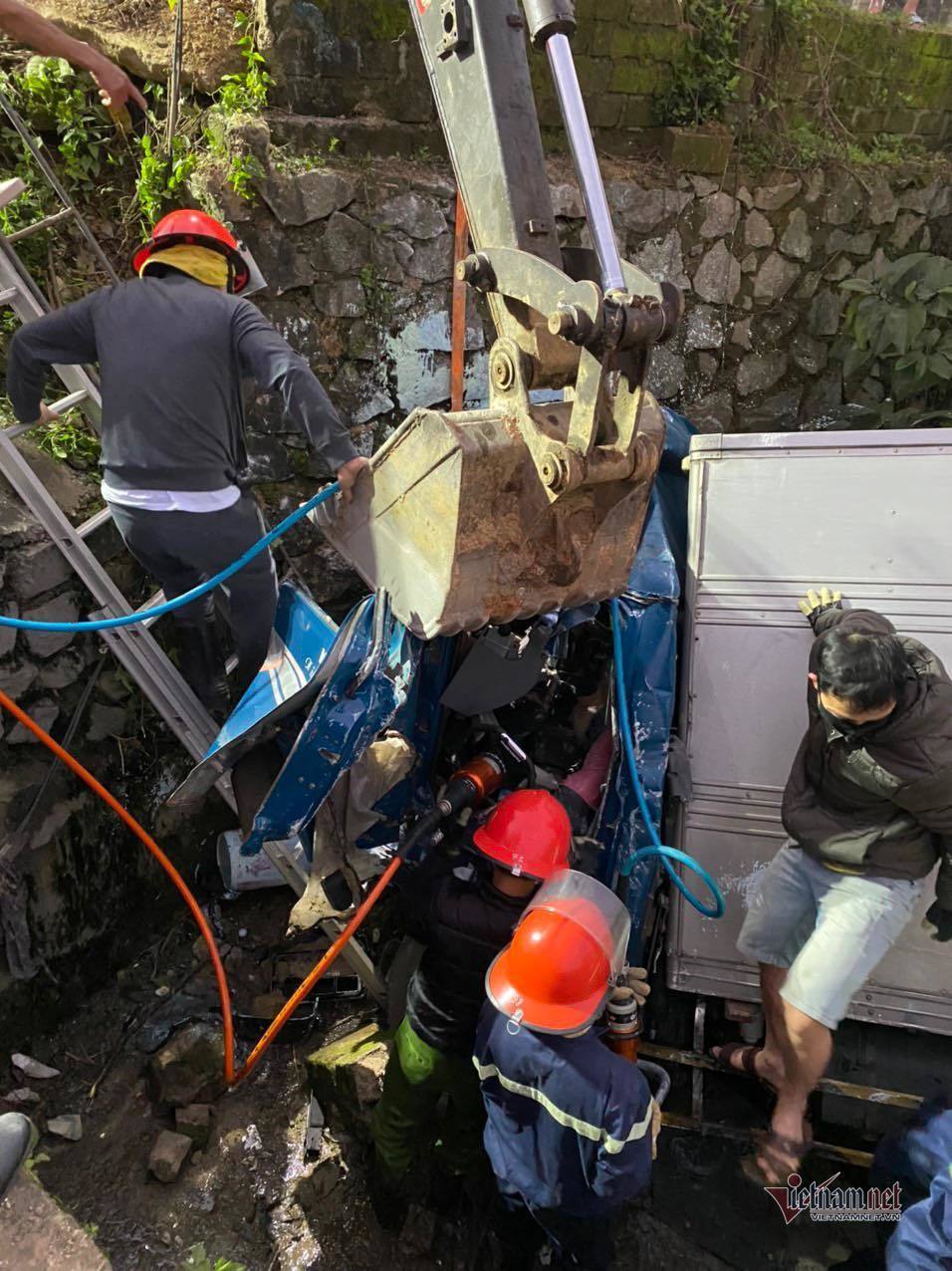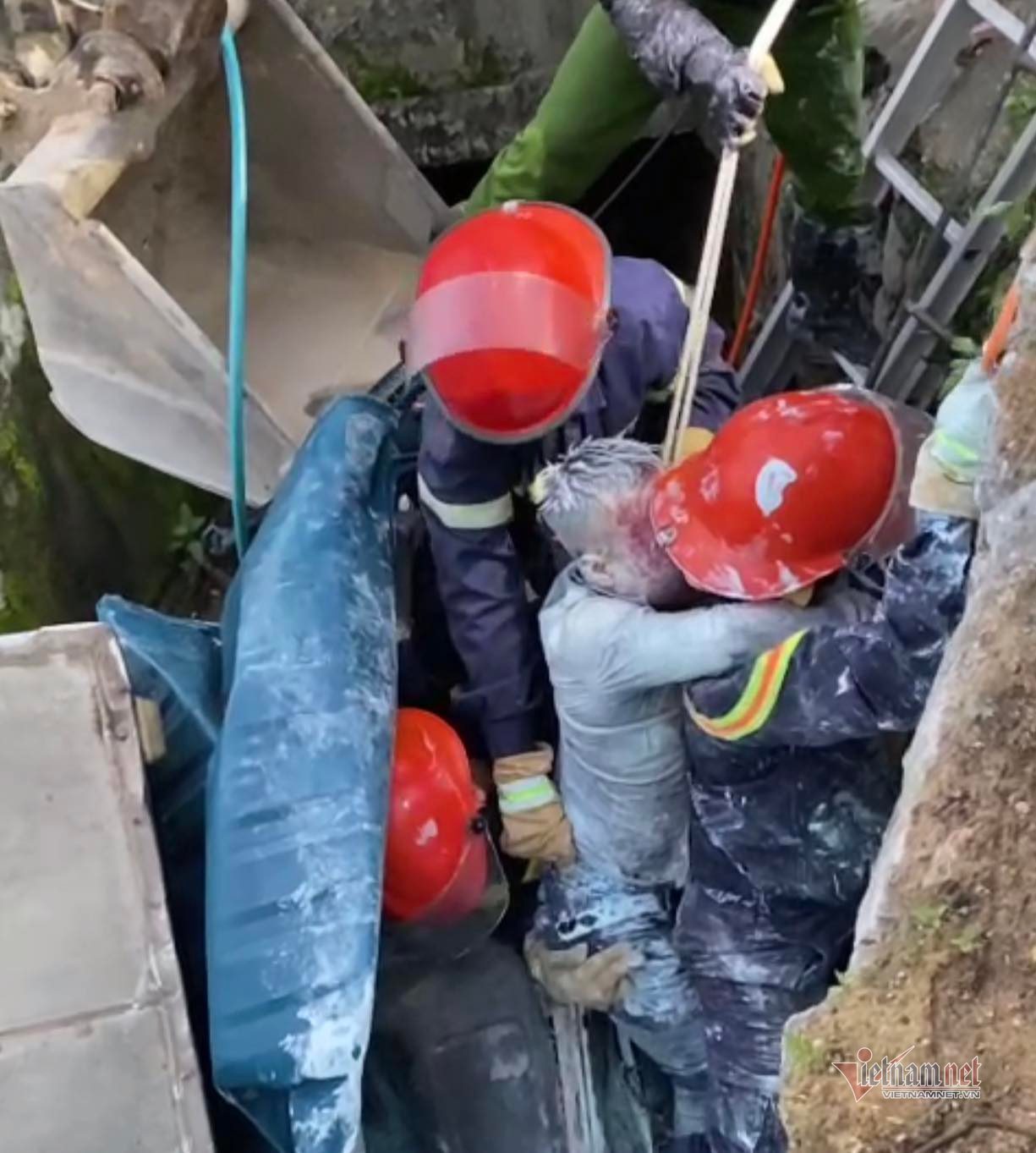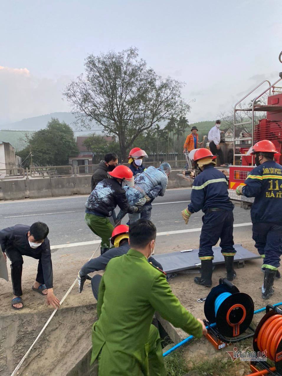 Lực lượng cứu hộ phải dùng xe cẩu đỡ phần đầu xe tải. Sau hơn một giờ, tài xế đã được đưa ra khỏi cabin.