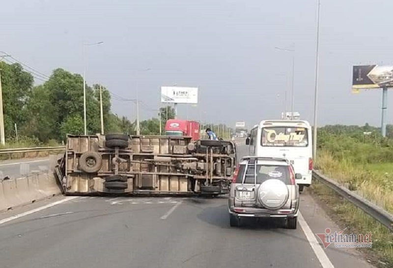 Xe tải lật chắn ngang đường khiến giao thông trên cao tốc bị ùn tắc kéo dài hàng km từ trạm thu phí Long Phước đến khu vực cầu Long Thành.