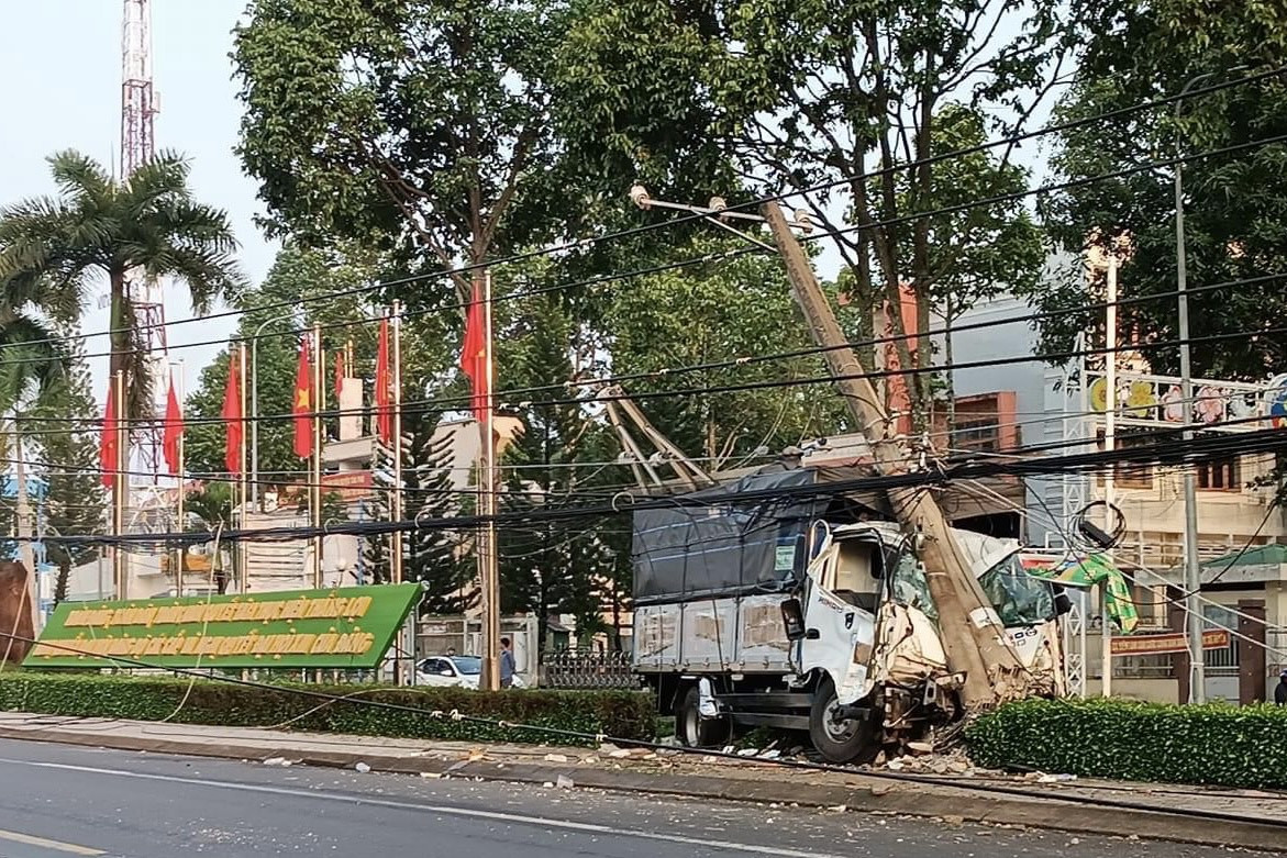 Cú tông mạnh khiến xe tải tiếp tục lao vào lề đường tông gãy 2 trụ điện trung thế làm hàng nghìn hộ dân mất điện. Tại hiện trường, phần đầu xe tải bẹp dúm biến dạng hoàn toàn, 2 trụ điện trung thế gãy đè lên xe tải. Còn ô tô 7 chỗ bị lật ngang, phần đuôi xe bị móp méo.
