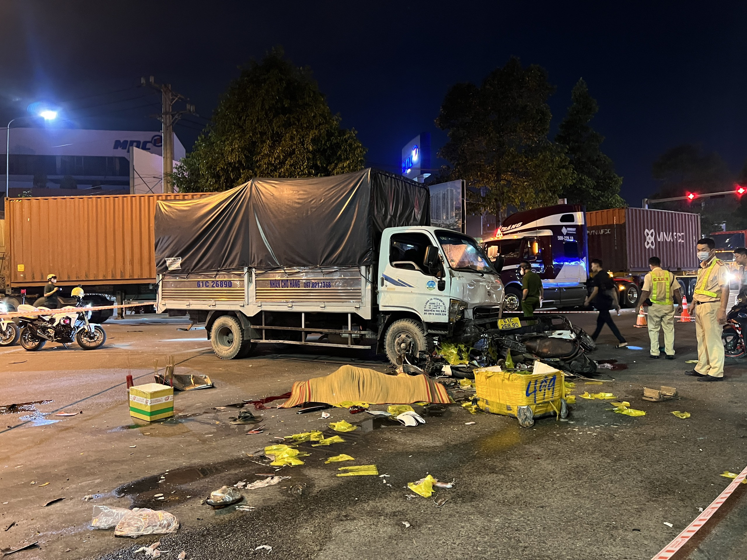 Sau va chạm, xe tải lùa nhiều xe máy dưới gầm rồi tông tiếp vào 1 xe container. Sự việc khiến 1 người đi xe máy tử vong tại chỗ, ít nhất 3 người khác bị thương được đưa đi cấp cứu.