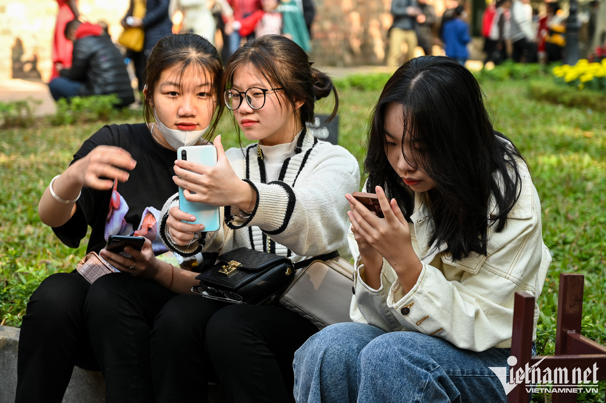 Nhiều bạn trẻ ngồi check in ngay bên ngoài cửa Văn Miếu trong lúc chờ người nhà mua vé.