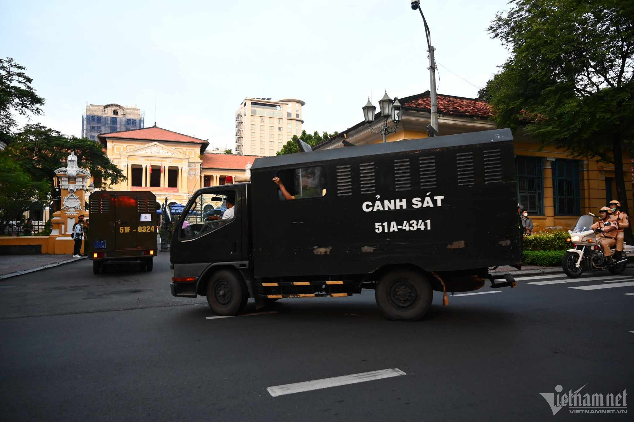Nhiều lực lượng cảnh sát giám sát khu vực cổng và trước phòng xử án, chỉ những người có giấy triệu tập mới được vào.
