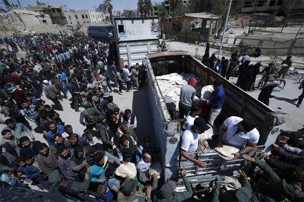 | Các nhà chức trách phát thực phẩm cho người dân Douma. (Ảnh: AP) |