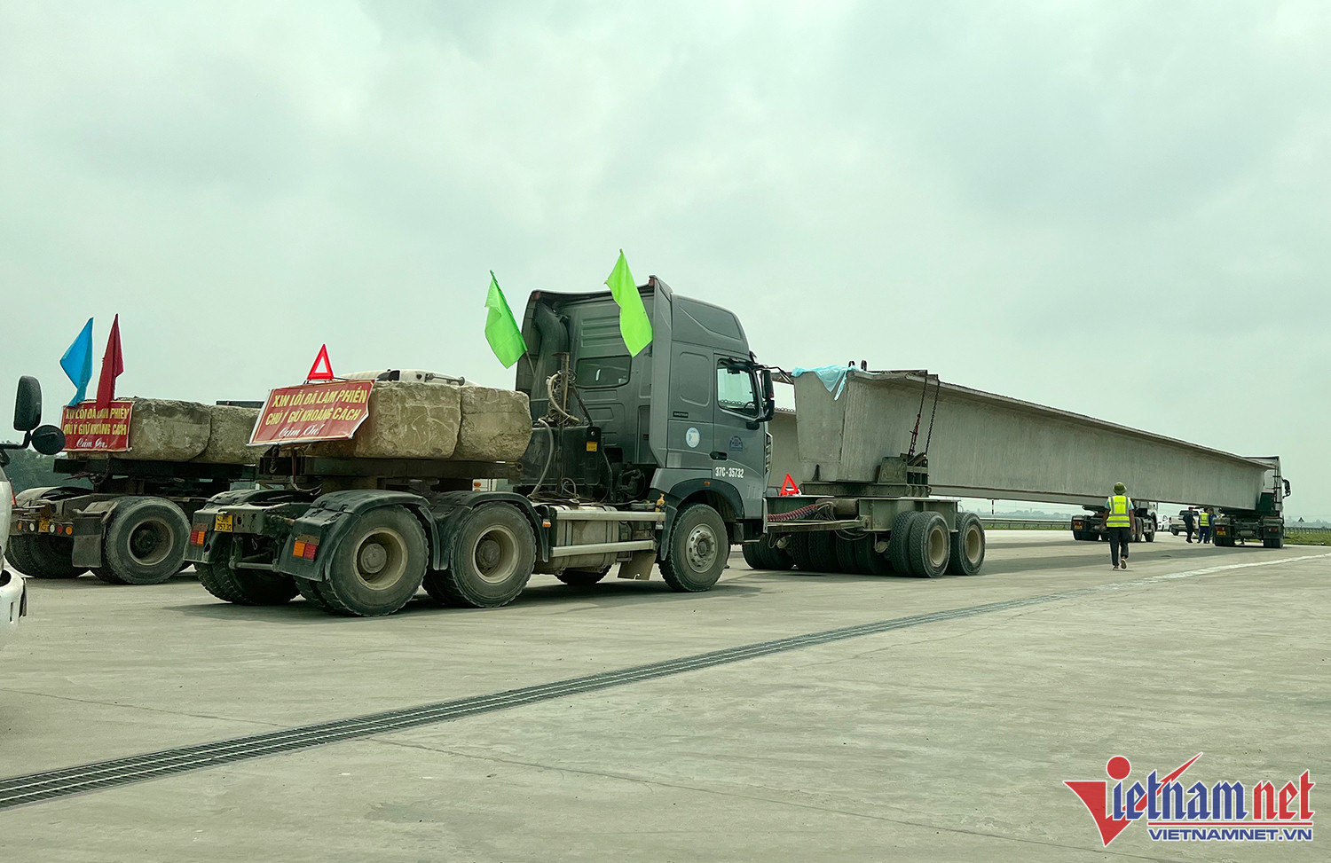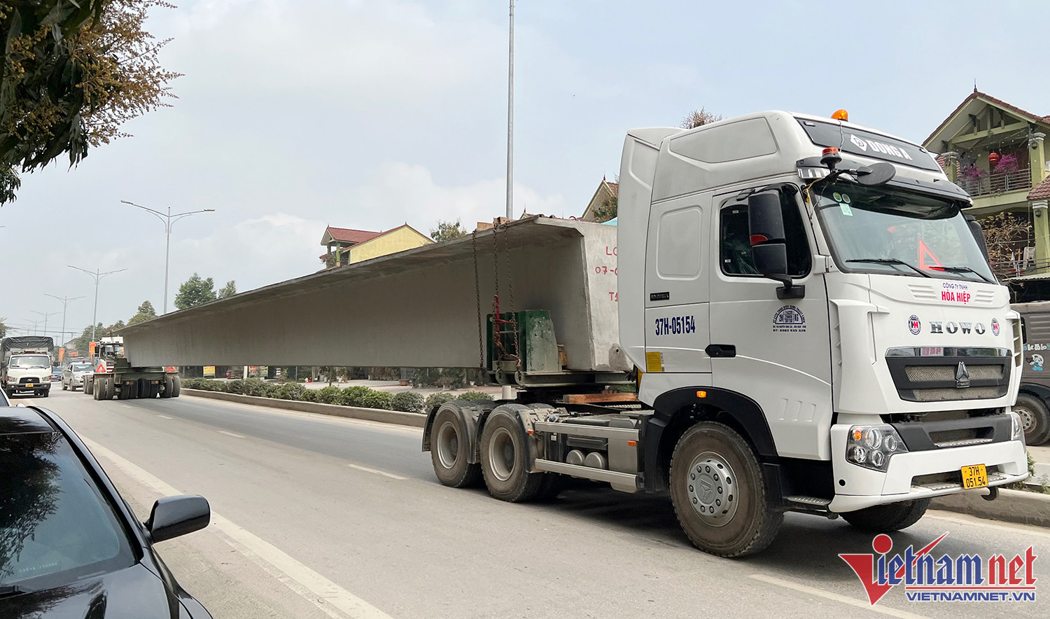 Tìm hiểu được biết, mỗi dầm cầu dài hơn 38m, nặng gần 100 tấn được cẩu lên 2 đầu ô tô đầu kéo. Để chở được dầm cầu rất nặng này, đơn vị vận tải đã tự chế điểm nối giữa xe đẩy từ phía sau và xe kéo phía trước để tăng lực chở. Đầu xe đẩy phía sau còn được cẩu lên 2 khối đá để giữ thăng bằng, hỗ trợ xe phía trước kéo dầm cầu. Mỗi một đầu xe kéo trước hoặc đẩy sau đều có 2 tài xế.
