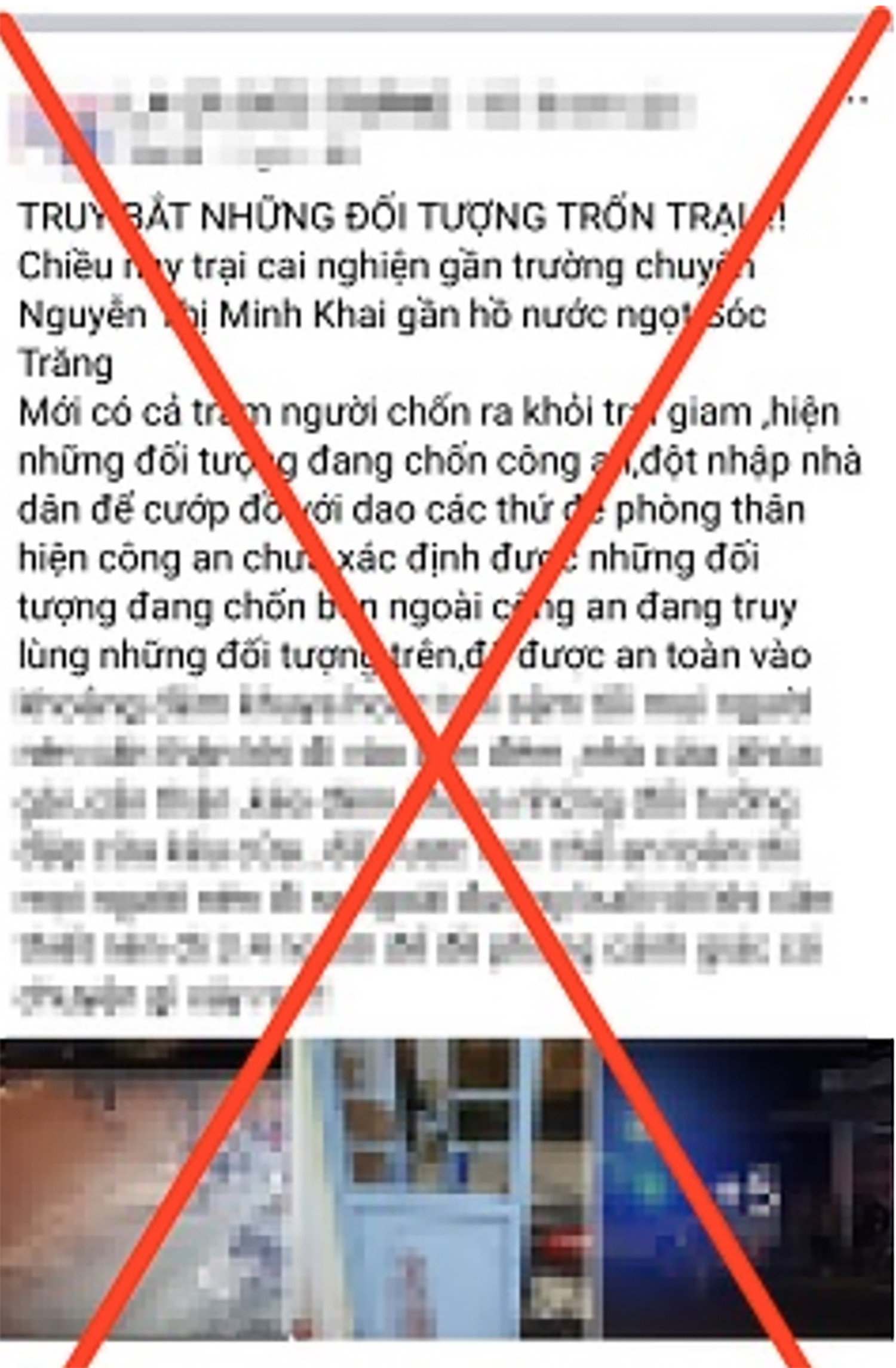 Trong khi đó, L.T.T. đăng tải nội dung: “Chiều nay trại cai nghiện gần trường chuyên Nguyễn Thị Minh Khai, gần hồ nước ngọt Sóc Trăng mới có cả trăm người trốn ra khỏi trại giam. Hiện những đối tượng đang trốn công an, đột nhập nhà dân để cướp đồ với dao các thứ để phòng thân…”.