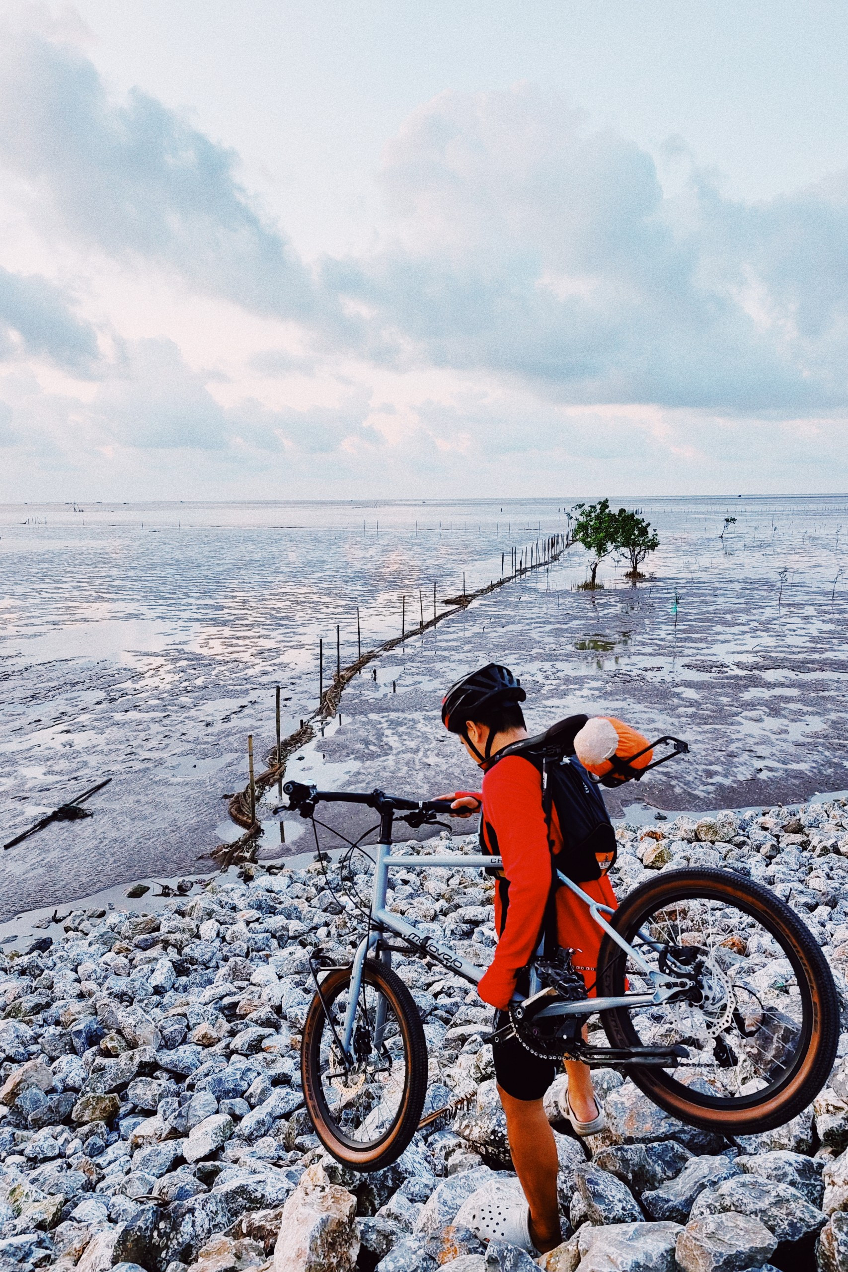 Sau khi xem những hình ảnh về “biển vô cực” trên mạng xã hội, anh Nguyễn Mạnh Hùng (ở Hải Phòng) cùng nhóm bạn đam mê đạp xe quyết định thức dậy lúc 3h30, xuất phát từ trung tâm thành phố rồi di chuyển thẳng đến phà Dương Áo (đoạn nối giữa huyện Kiến Thụy và huyện Tiên Lãng), tốn khoảng 1 giờ đồng hồ.