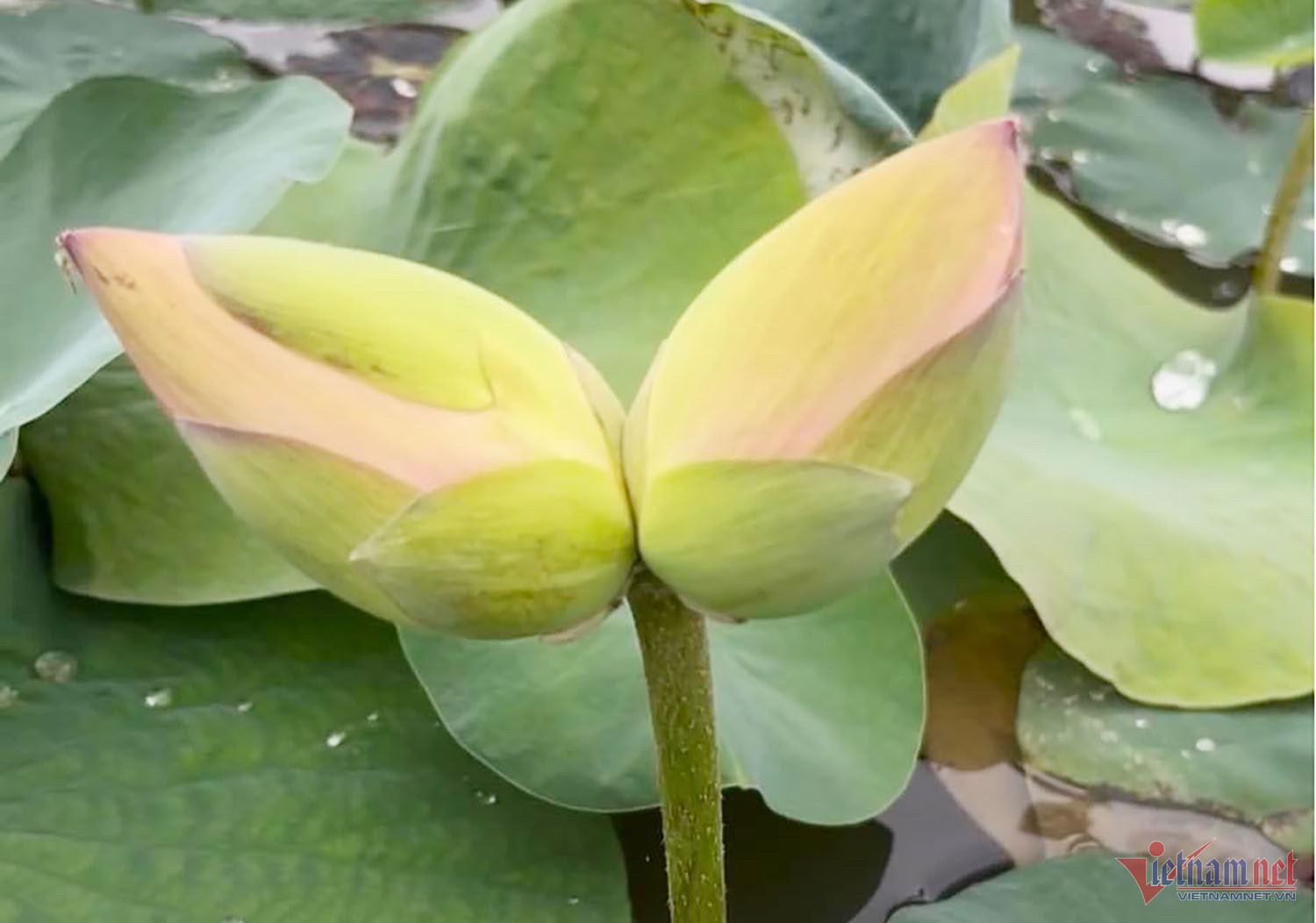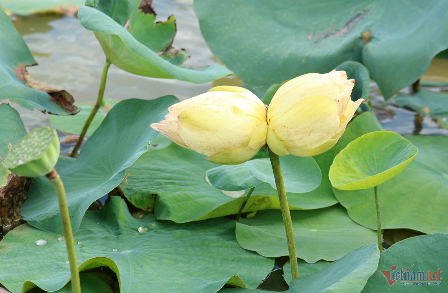 Chia sẻ với VietNamNet, chị Nguyễn Thị Hồng - đại diện hợp tác xã Sen quê Bác, xã Kim Liên (huyện Nam Đàn, Nghệ An) cho biết, trong mấy ngày qua, ở đầm trồng giống sen mới Bỉ Ngạn Vàng xuất hiện 1 bông tịnh đế (một đế 2 bông) màu vàng và 1 bông tịnh đế màu trắng.