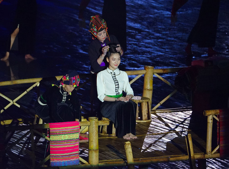 Bên cạnh đó là lễ Tằng Cẩu, búi tóc cho cô gái về nhà chồng với ý nghĩa lớn lao về văn hoá, sự thuỷ chung của người Thái. Điểm ấn tượng của những câu chuyện kể bên cạnh các đại cảnh, chính là những điểm nhấn tinh tế khi Tổng đạo diễn Lê Hải Yến đã lấy hình ảnh người con gái Thái làm sợi dây liên kết toàn bộ câu chuyện. Đó là hình ảnh của một cô gái Thái được mẹ cha yêu thương, chăm sóc khi còn nhỏ, lớn lên trong chiếc nôi văn hoá của dân tộc mình và bước vào tình yêu với người con trai, nguyện thề thủy chung như biểu tượng, ý nghĩa của Tằng cẩu, và từ đây họ chính là những người lại trao truyền sức sống văn hoá của dân tộc mình cho con, cho cháu giống như ẩn ý của hình ảnh cứ dệt mãi, dệt mãi những tấm thổ cẩm trên sân khấu cùng ca khúc Chiếc khăn Piêu mà Tùng Dương thể hiện.