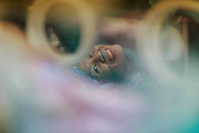 | Bức ảnh người sản phụ mỉm cười nhìn con được anh Nguyễn Văn Quân ghi lại. |