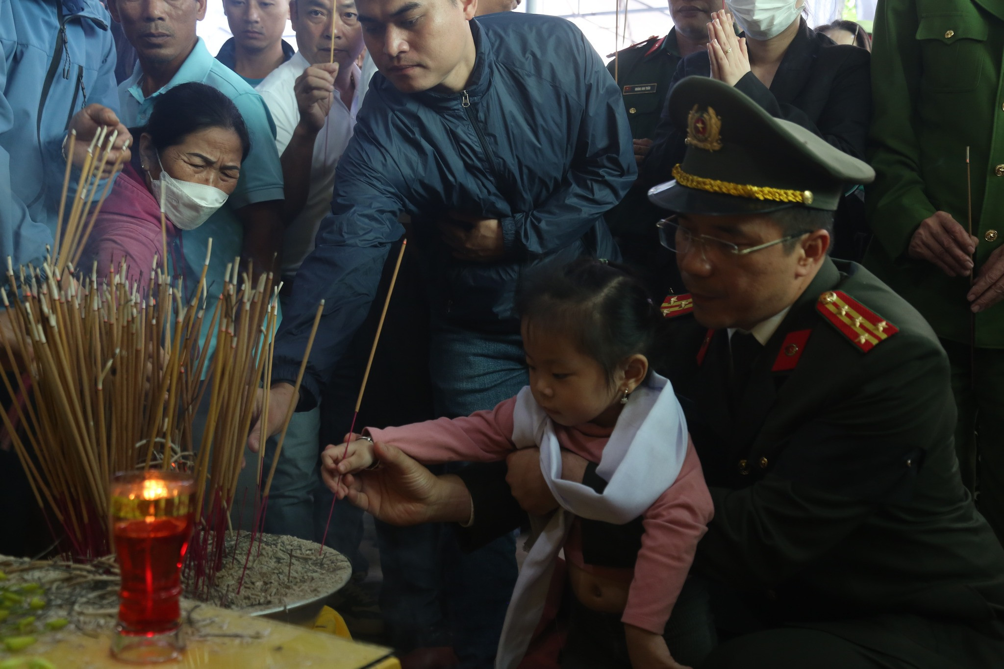 "Trước đó anh còn nhắn tin cho em, hứa xong nhiệm vụ sẽ về mua đồ chơi cho con, lên kế hoạch sắp xếp chuyến đi chơi xa cho cả nhà. Anh còn nói với em sẽ cố gắng xây nhà vào năm sau. Nhưng bây giờ, tất cả mãi dang dở, anh lại bỏ mẹ con em rời đi như thế này...", chị Tú khóc ngất tại đám tang của chồng.