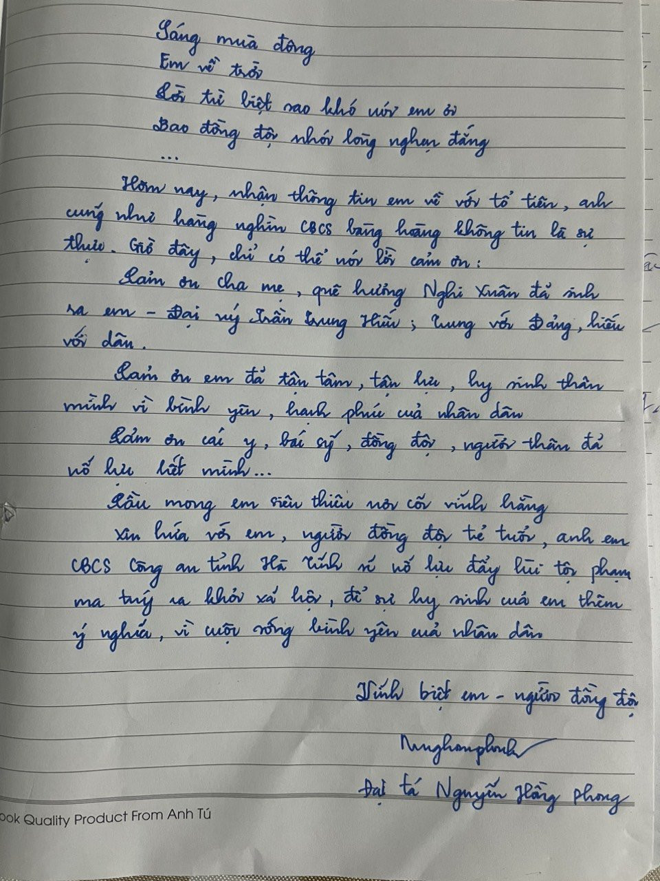 Giờ đây, chỉ có thể nói lời cảm ơn: Cảm ơn cha mẹ, quê hương Nghi Xuân đã sinh ra em - Đại úy Trần Trung Hiếu, trung với Đảng, hiếu với dân. Cảm ơn em đã tận tâm, tận lực, hy sinh thân mình vì bình yên, hạnh phúc của nhân dân... Xin hứa với em, người đồng đội trẻ tuổi, anh em CBCS Công an tỉnh Hà Tĩnh sẽ nỗ lực đẩy lùi tội phạm ma túy ra khỏi xã hội, để sự hy sinh của em thêm ý nghĩa, vì cuộc sống bình yên của nhân dân”.