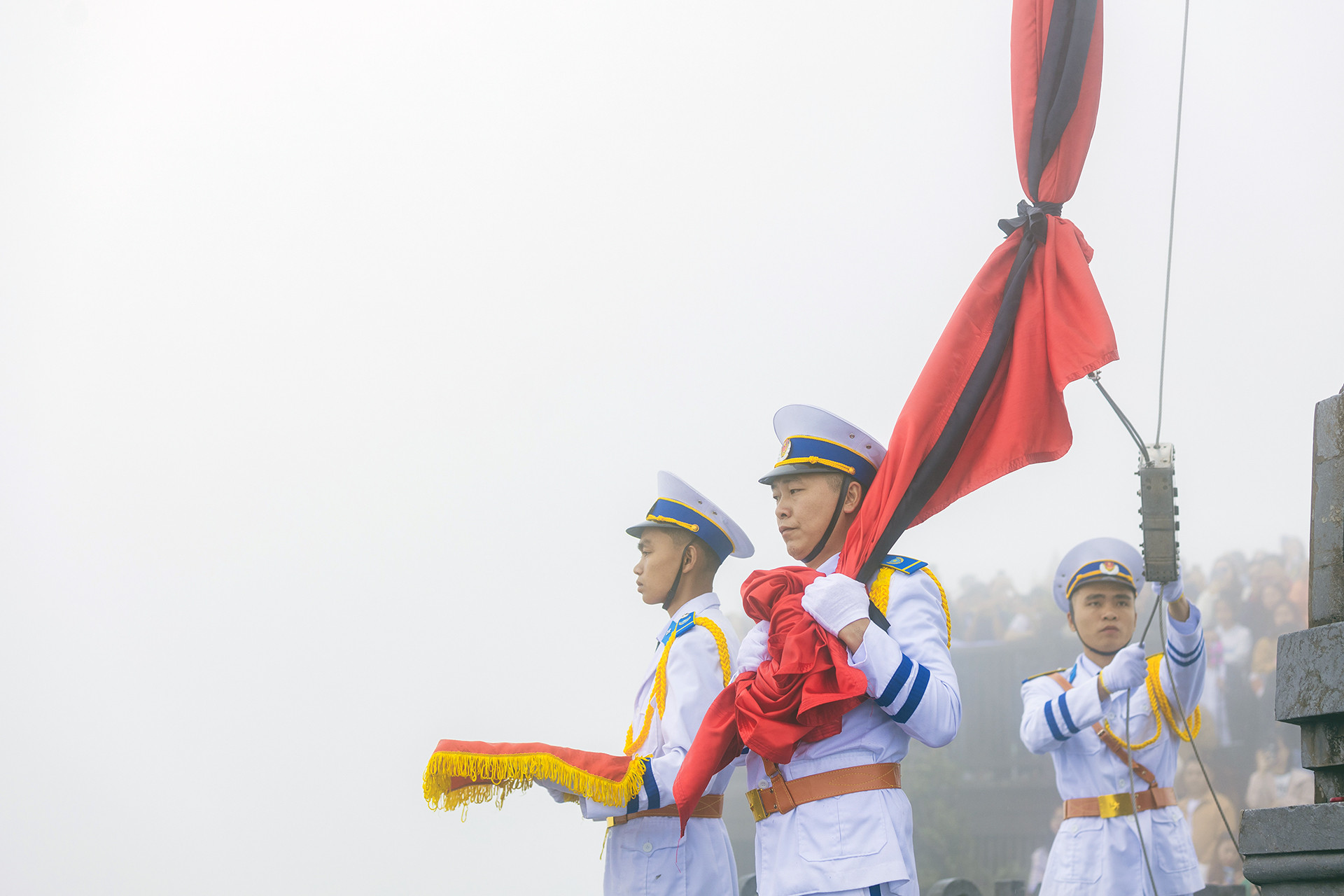 Đúng 6h00, tại Quảng trường Ba Đình, nghi thức treo cờ rủ được bắt đầu. Quốc kỳ được thắt lại bằng băng vải đen và treo ở độ cao 2/3 chiều cao của cột cờ. Cờ rủ Quốc tang là nghi thức treo cờ Tổ quốc ở vị trí thấp hơn so với vị trí bình thường để thể hiện sự tôn kính và thương tiếc đối những người có công lao to lớn với đất nước.