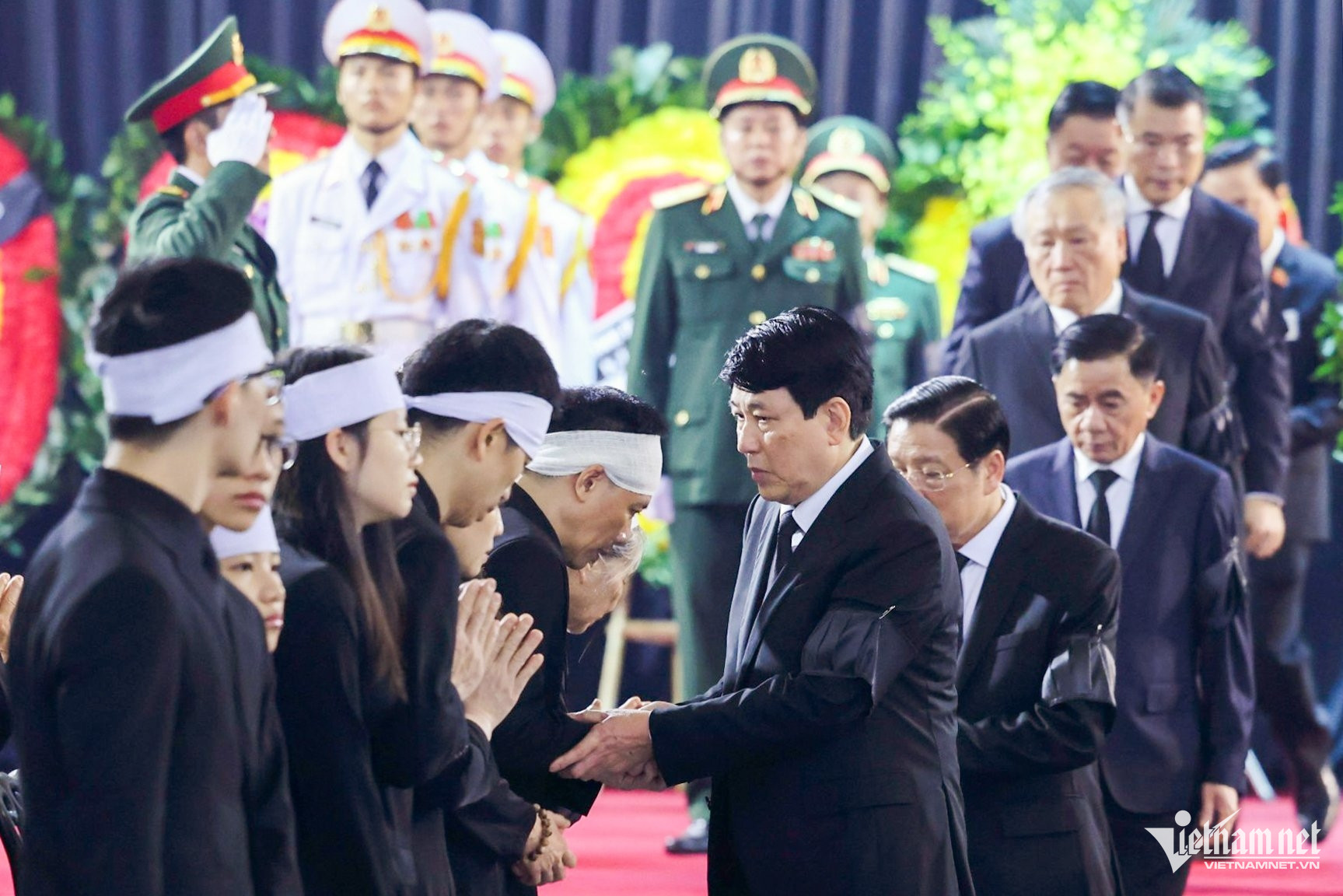 Sau khi bước chậm rãi quanh linh cữu Tổng Bí thư Nguyễn Phú Trọng, Chủ tịch nước Tô Lâm và các thành viên trong đoàn đã đến nắm tay phu nhân Ngô Thị Mận và gia quyến, chia sẻ sự mất mát.