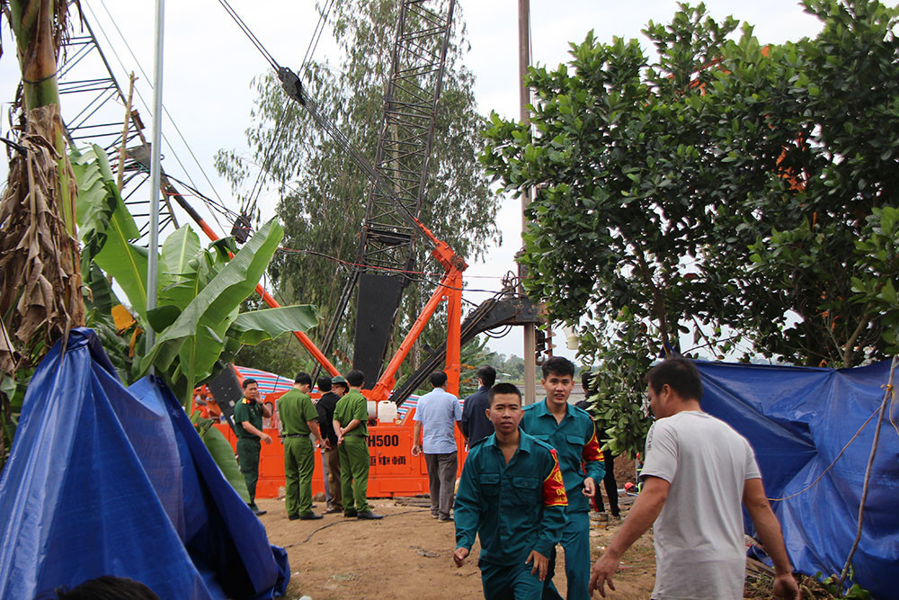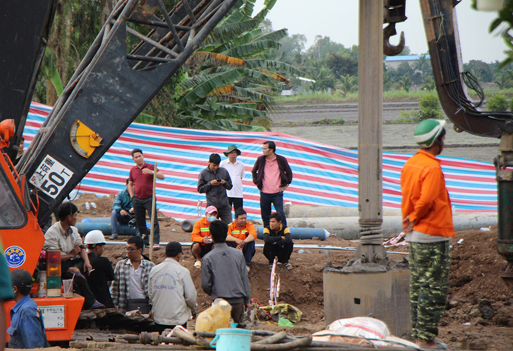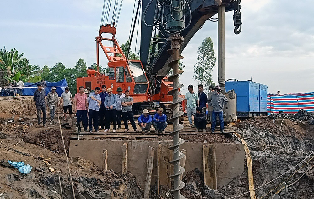 9h20, công tác tìm kiếm vẫn diễn ra khẩn trương, máy khoan liên tục hoạt động. Chủ tịch UBND tỉnh Đồng Tháp Phạm Thiện Nghĩa vừa đến hiện trường.