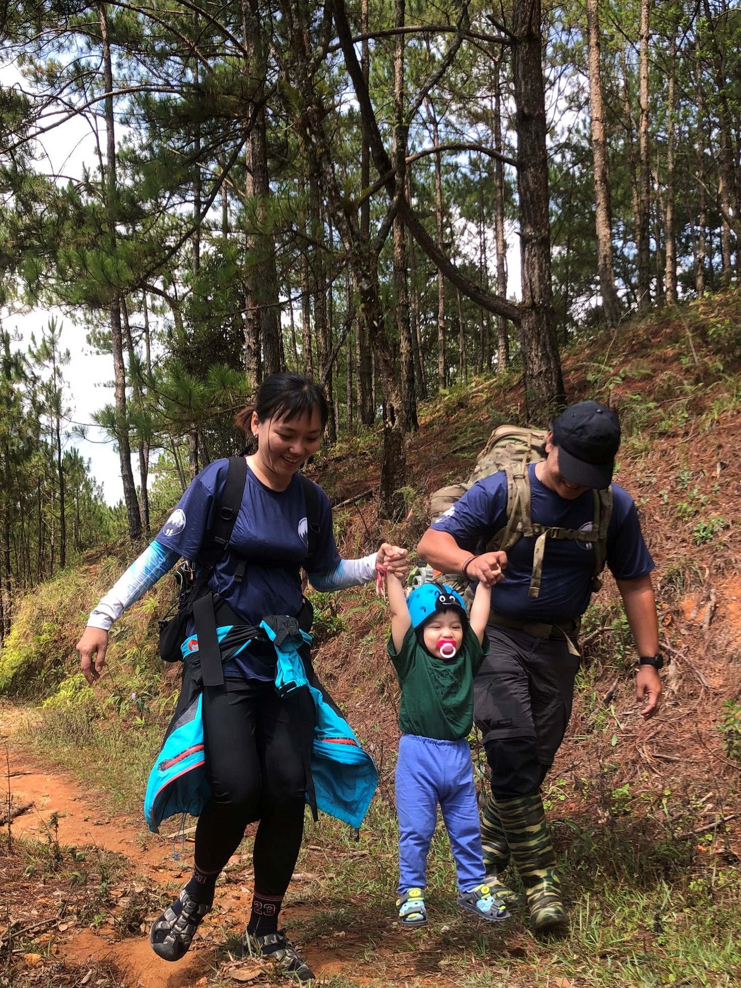 Chị Phương - anh Đạo dẫn con trai 19 tháng tuổi đi xuyên rừng 2 ngày, 1 đêm vào tháng 4 vừa qua. Hai vợ chồng hiện làm công việc liên quan tới thể thao mạo hiểm. |