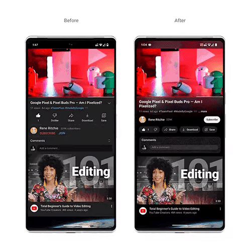 YouTube vừa thông báo thay đổi toàn bộ giao diện của mình, bổ sung những tính năng mới như phóng to một phần video (pinch-to-zoom), tìm chính xác đoạn video cần xem, chế độ hình nền (ambient mode), chế độ tối và những nút chức năng mới. Người dùng sẽ nhận được bản cập nhật ngay từ hôm nay.